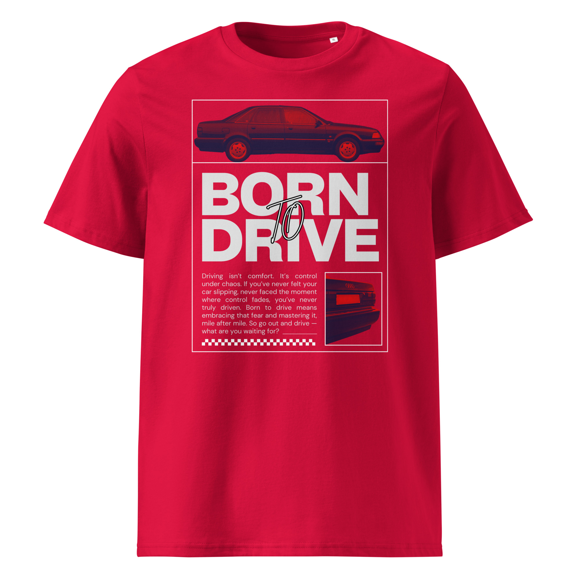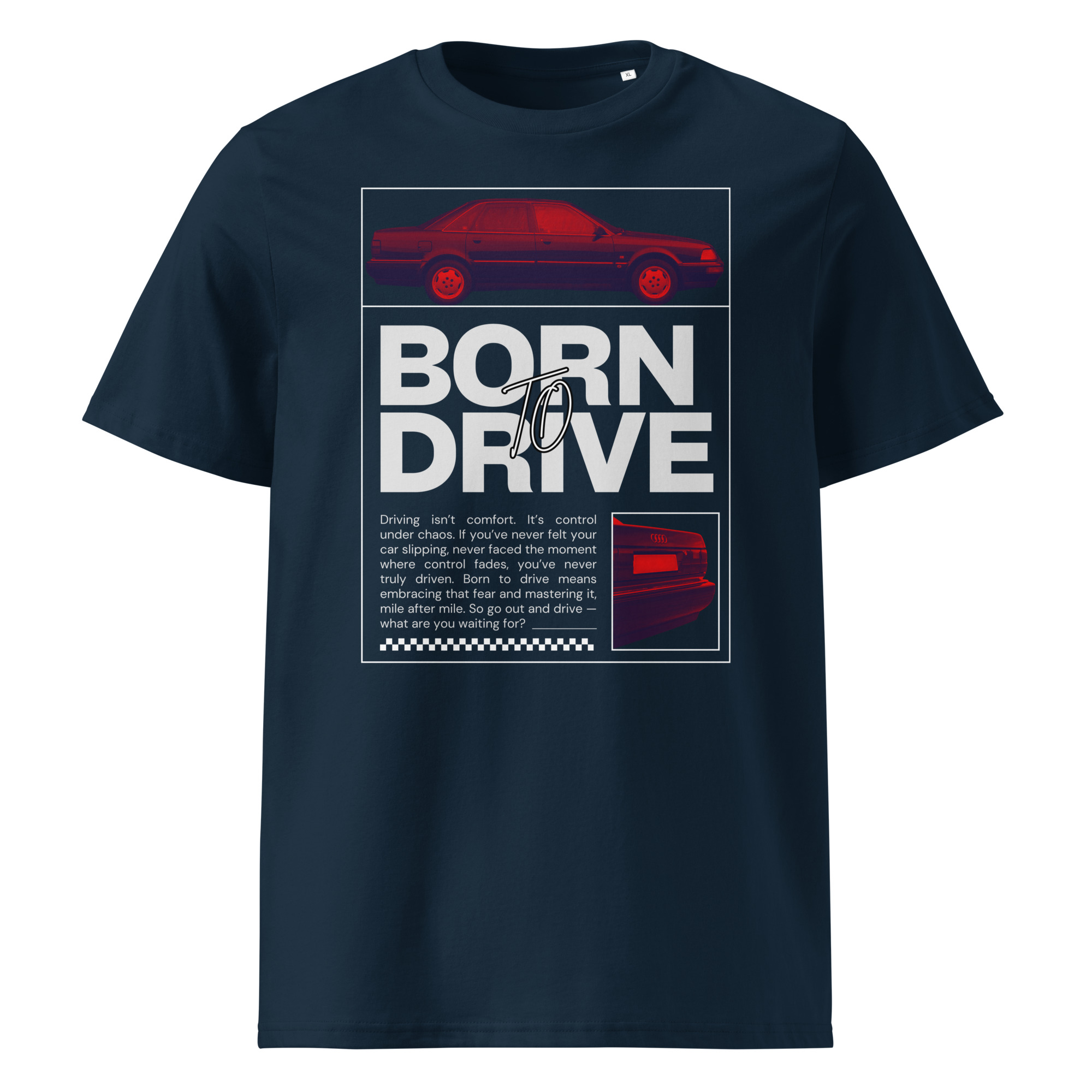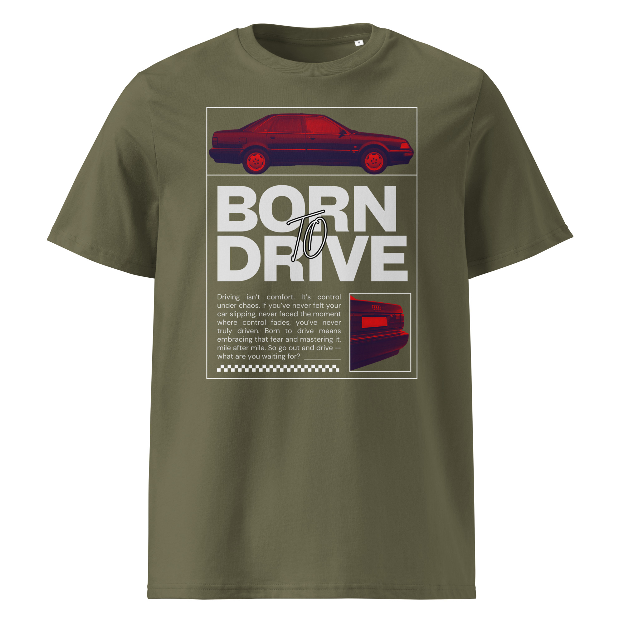 Audi V8. Sisuliselt samal baasil tehtud, mis Audi 200, kuid kere tähis anti sellele D11. Paljud seda ei tea. Aga selle särgi tegin, sest minu heal sõbral on selline oma garaažis seismas. Ja minu soov oleks, et ta selle särgi endale ostaks ja see siis teda selle autoga tegelema motiveeriks. Äge klassik, V8 müdin, mõnus kulgur. Särgist ka. Sama materjal ja lõige, mis kõige esimesel Born To Drive särgil. Ehk siis kvaliteetne. Aga eks sa pead ise ostma ja proovima. Mina tellisin ka ise, sest kui neid müün, siis pean teadma, mis kvaliteediga need on.